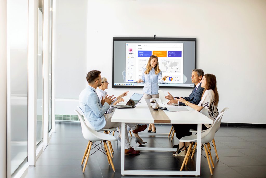 Подключите свой ноутбук или выведите встроенный в панель OPS PC (опция), запустите Zoom, TrueConf, Яндекс Телемост, Salute Jazz или любую другую привычную платформу, и вы «онлайн», вас видно и слышно!