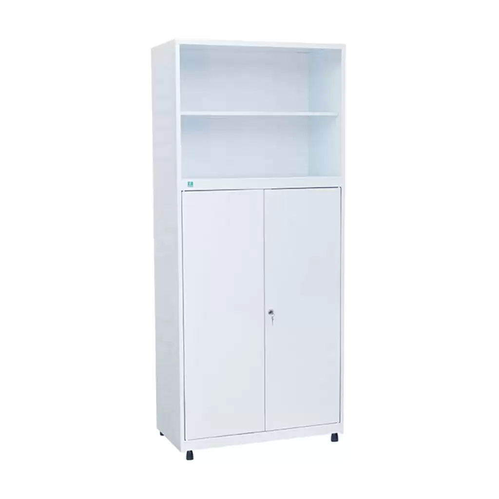- Функциональность — нижняя секция с тремя полками и двумя запирающимися дверцами, верхнее открытое отделение с одной полкой.