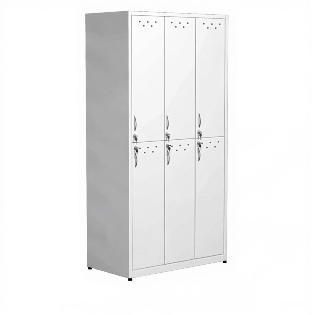 • Наполнение: два яруса, 6 дверей, замки, отверстия для вентиляции. Каждый отдел оснащен полкой под головные уборы, 2 крючка.