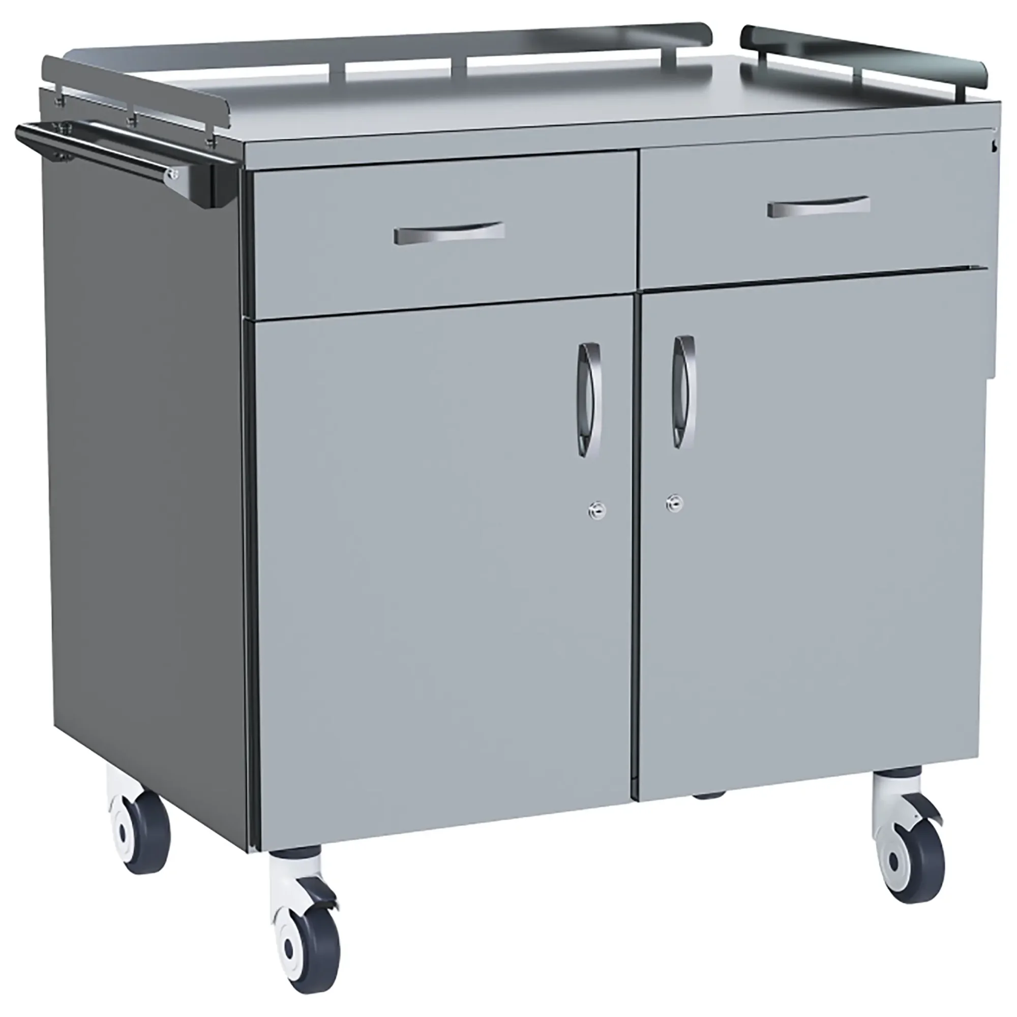 • колеса поворотные, самоориентирующиеся, диаметром 100 мм, комплектуются надёжной стальной вилкой с прецизионным радиально-упорным подшипником, ободом из полипропилена и шинкой из серого полиуретана, не оставляющего следов на полу, два колеса – с индивидуальным тормозным устройством;