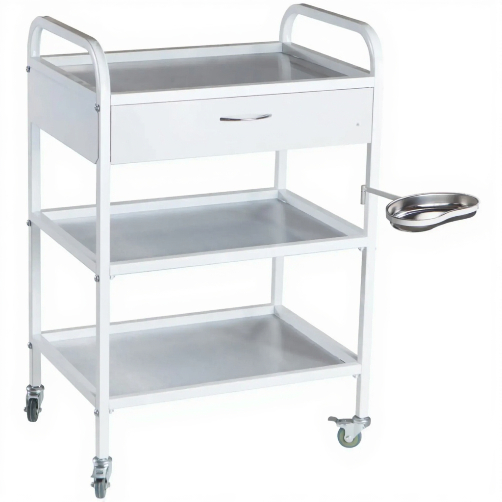 Стол инструментальный процедурный специальный СИПС-03-01-Н (колёса серая резина) — это компактный мобильный стол, предназначенный для размещения на рабочем месте врача всего необходимого: инструмента, лекарственных препаратов и приборов. Модель имеет каркас из профильной стальной трубы, полки из нержавеющей стали, выдвижной ящик и почкообразный лоток на поворотном кронштейне.
