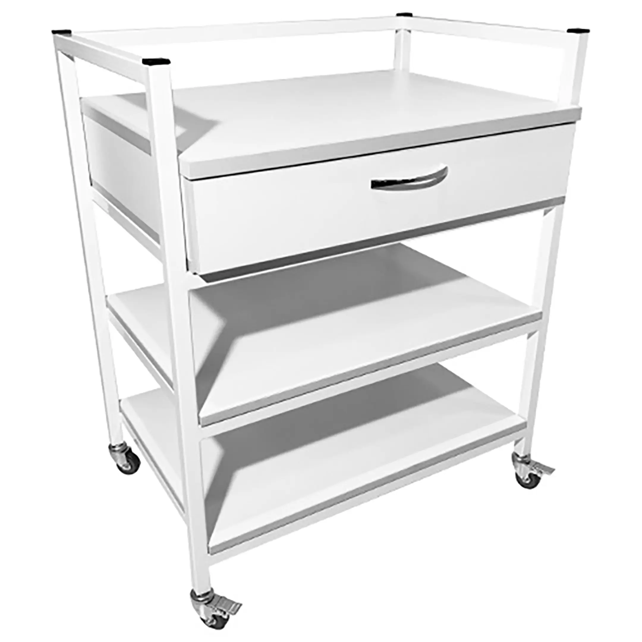 Стол лабораторный мобильный СЛм 17.001 (белый) представляет собой идеальное решение для временного размещения и удобного перемещения различных инструментов, предметов или приборов в медицинских учреждениях и лабораториях. Модель оснащена выдвижным ящиком, двумя полками и установлена на колесные опоры. Каркас выполнен из стального профиля, столешница из ЛДСП толщиной 16 мм.