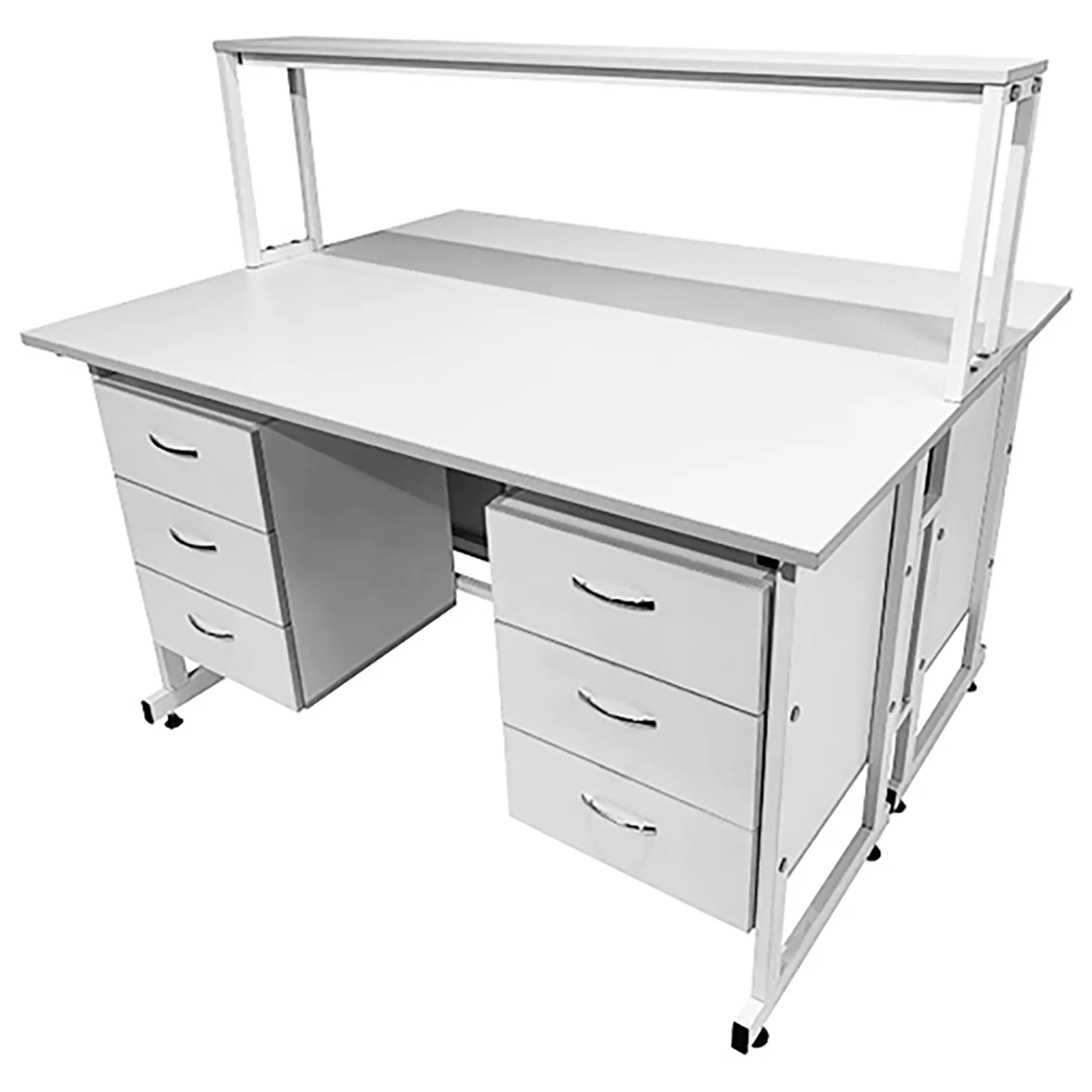 Стол лабораторный островной с надстройкой Сло 22.011 (белый) — это идеальное решение для организации сразу двух рабочих мест в лабораториях и медицинских учреждениях. Модель обеспечивает рациональное использование пространства и максимальный комфорт для сотрудников. Каждое рабочее место оснащено двумя подвесными тумбами с тремя выдвижными ящиками, а центральная надстройка имеет одну полку. Каркас выполнен из стального профиля, столешницы из ЛДСП толщиной 22 мм.