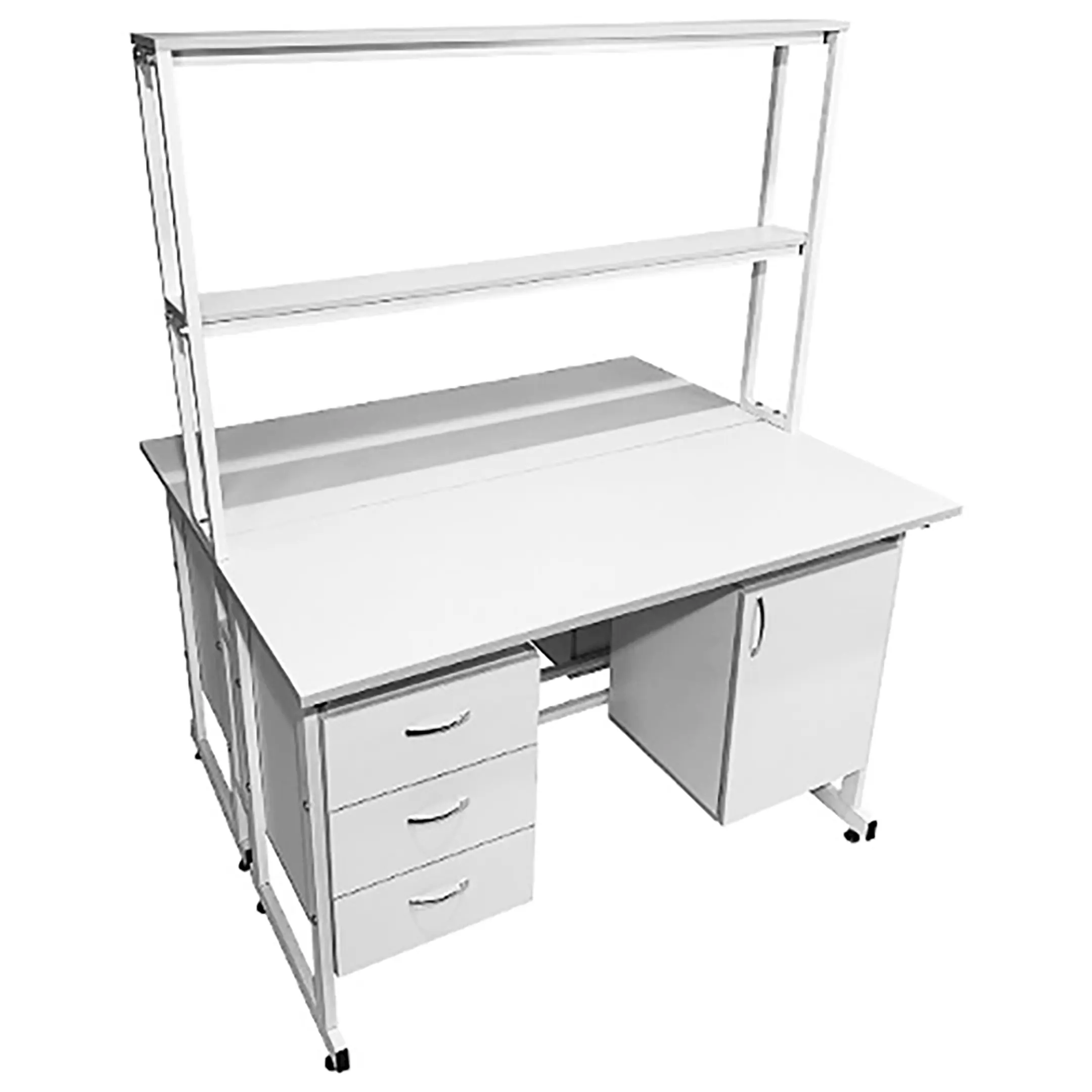 Стол лабораторный островной с надстройкой Сло 22.018 (белый) — это прекрасное решение для организации сразу двух рабочих мест в лабораториях и медицинских учреждениях. Модель оснащена двумя рабочими местами, каждое с двумя подвесными тумбами: слева с тремя выдвижными ящиками, справа с распашной дверкой и полкой, а также центральной надстройкой с двумя полками. Каркас выполнен из стального профиля, столешницы из ЛДСП толщиной 22 мм.