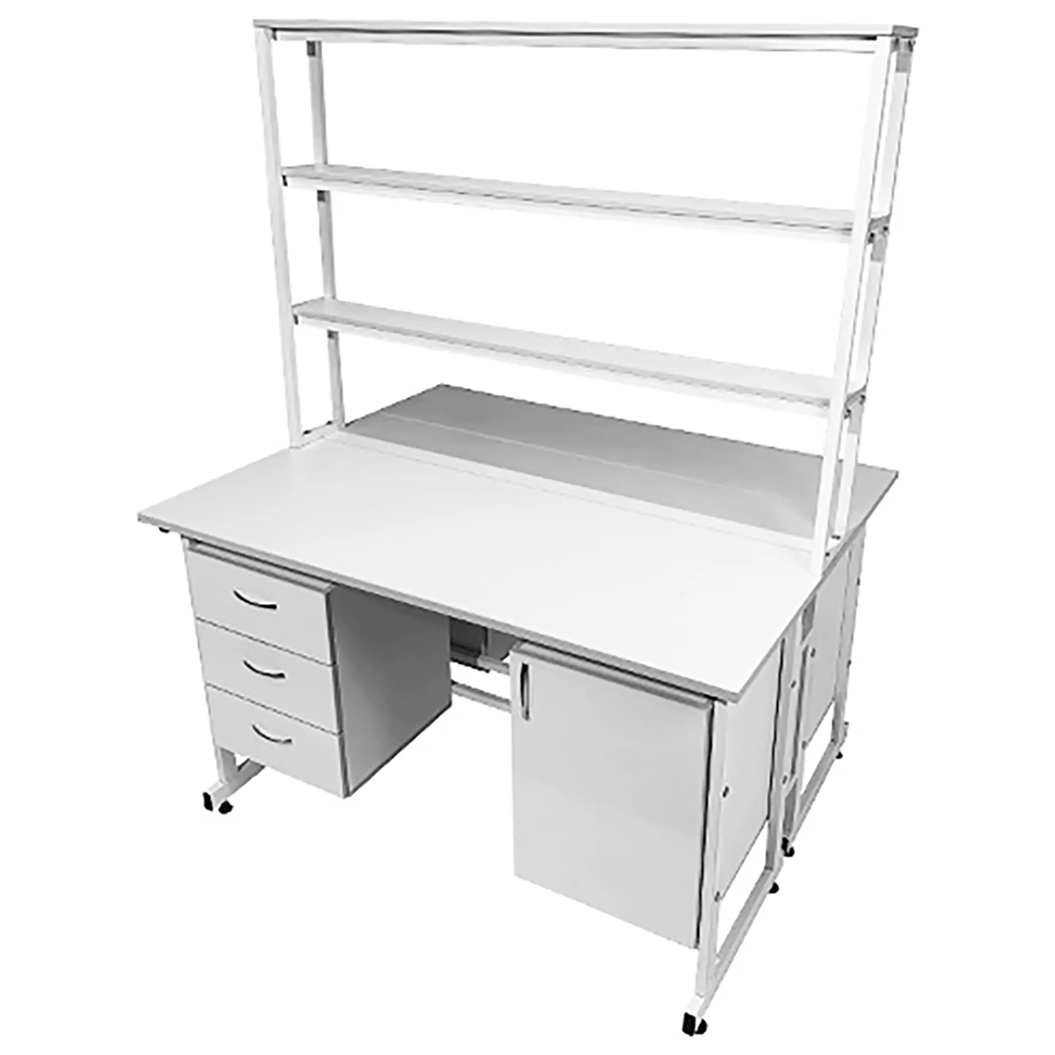 Стол лабораторный островной с надстройкой Сло 22.024 (белый) — это универсальное и практичное решение для организации рабочих мест в медицинских учреждениях и научных лабораториях. Модель обеспечивает возможность разместить два полнофункциональных рабочих места, помогая оптимально использовать доступное пространство. Каждое рабочее место оснащено двумя подвесными тумбами с ящиками и полками, а центральная надстройка имеет три полки. Каркас выполнен из стального профиля, столешницы из ЛДСП толщиной 22 мм.