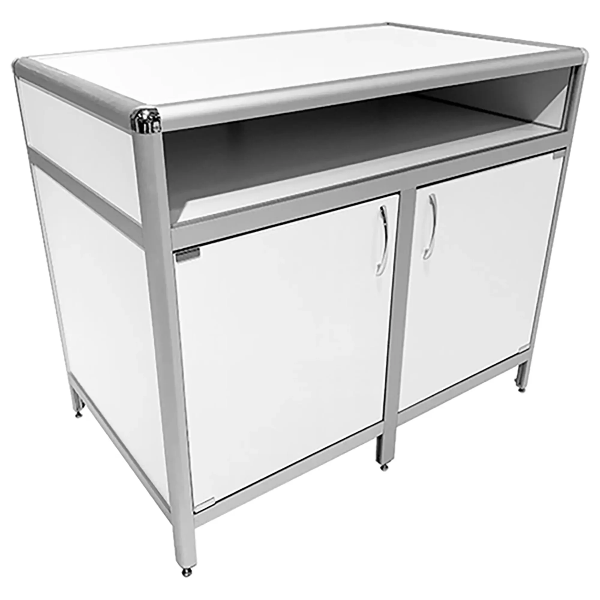 Стол-тумба лабораторная MED 12.009al (белый) — это функциональное решение для хранения лабораторного инвентаря, приборов и материалов в лабораториях и медицинских учреждениях. Модель оснащена вместительной нишей под столешницей (940х540х139 мм) и двумя тумбами с распашными дверками и полками внутри (полки 463х545 мм). Каркас выполнен из алюминиевого профиля, столешница из ЛДСП толщиной 16 мм.