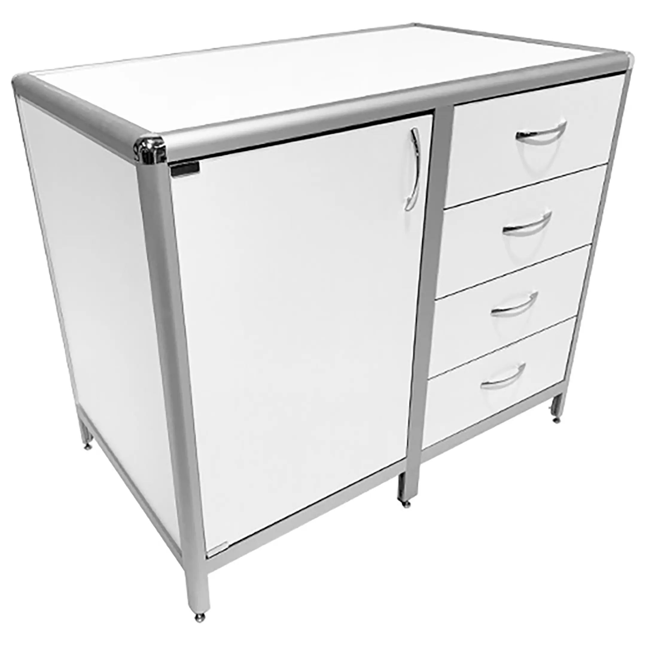 Стол-тумба лабораторная MED 12.012al (белый) — это функциональное решение для хранения лабораторного инвентаря, приборов и материалов в лабораториях и медицинских учреждениях. Модель оснащена тумбой с дверкой и полкой внутри (полка 463х545 мм), а также отделением с четырьмя выдвижными ящиками. Каркас выполнен из алюминиевого профиля, столешница из ЛДСП толщиной 16 мм.