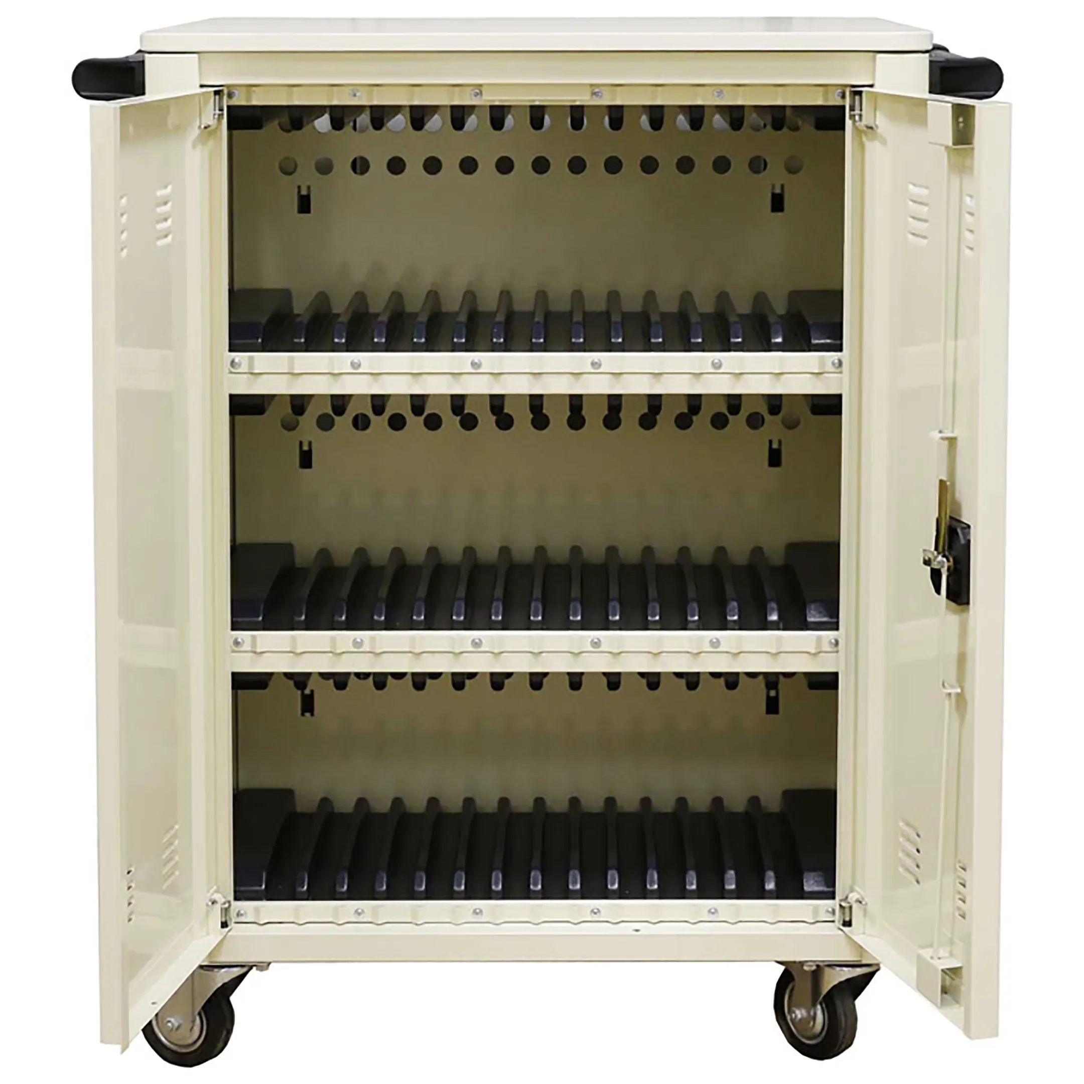 - Централизованная зарядка и хранение — позволяет одновременно заряжать все планшеты (обычно от 10 до 40 устройств) от одной розетки, благодаря интеллектуальной системе распределения питания, и хранить их в защищенных индивидуальных отсеках.