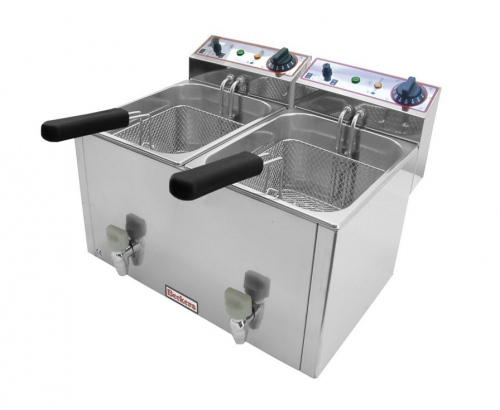 Электрическая фритюрница предназначена для обжаривания разнообразных продуктов (картофель, мясо, рыба, овощи и фрукты в кляре) в разогретом до определенной температуры, растительном или животном масле (фритюре). Фритюрница с двумя ваннами, вместимостью 8 л каждая, изготовленные из нержавеющей стали. Ванны имеют отличную прочность и долговечность, а также, благодаря скругленным углам, их очень легко чистить. Наличие двух ванн позволяет готовить разные продукты одновременно без смешивания запахов.Несмотря на достаточно компактные габариты и вес - аппарат имеет хорошую производительность работы. Также фритюрница имеет два крана для слива отработанного масла (для каждой ванны). Кроме того, модель оснащена специальным микровыключетелем, который не допустит нагрева ванны, если в ней нет масла.