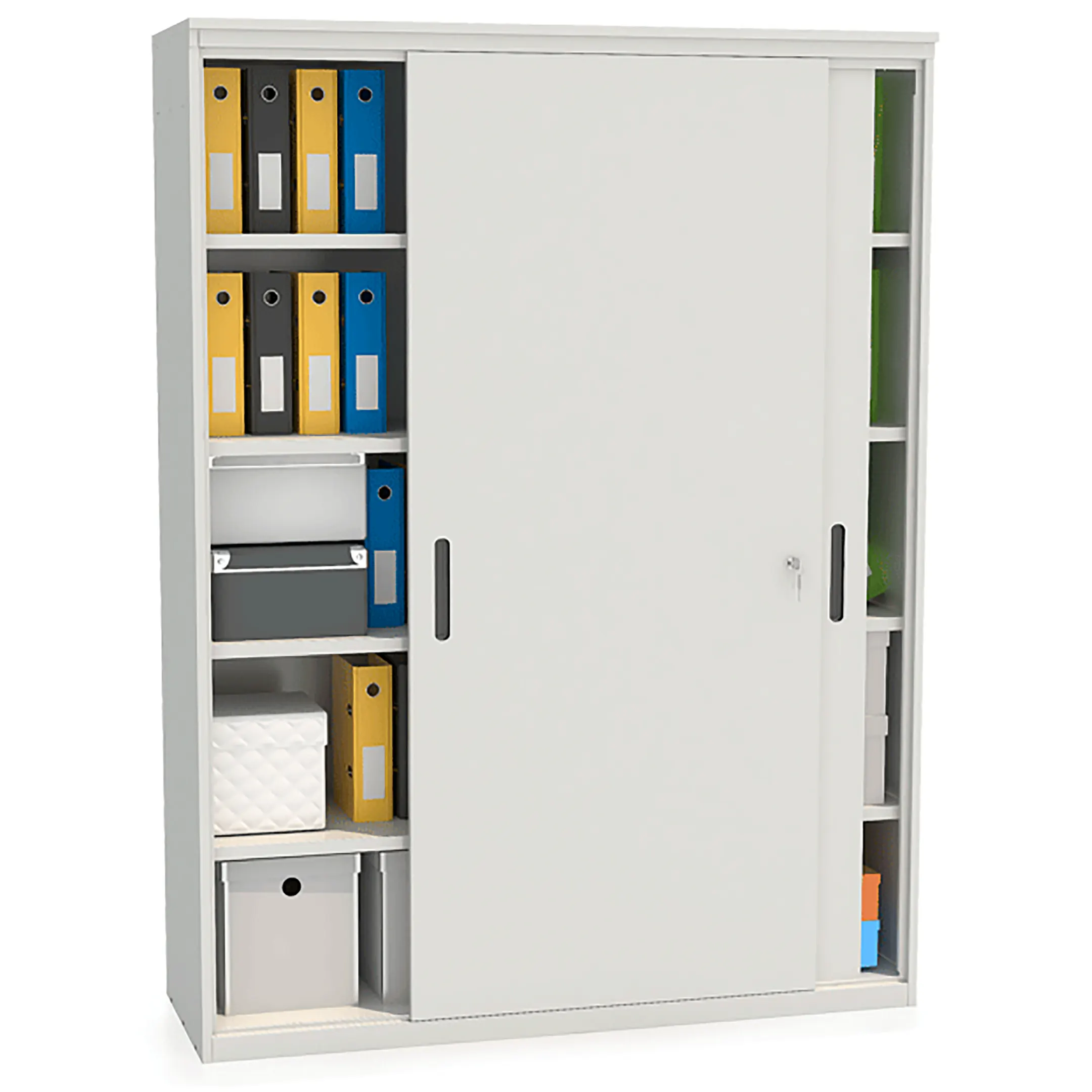 - Эргономичный доступ и современный дизайн — раздвижные двери обеспечивают полный обзор и удобный доступ ко всему содержимому. Строгий и лаконичный дизайн делает шкаф уместным в любом современном деловом интерьере, от офиса open-space до отдельного кабинета.