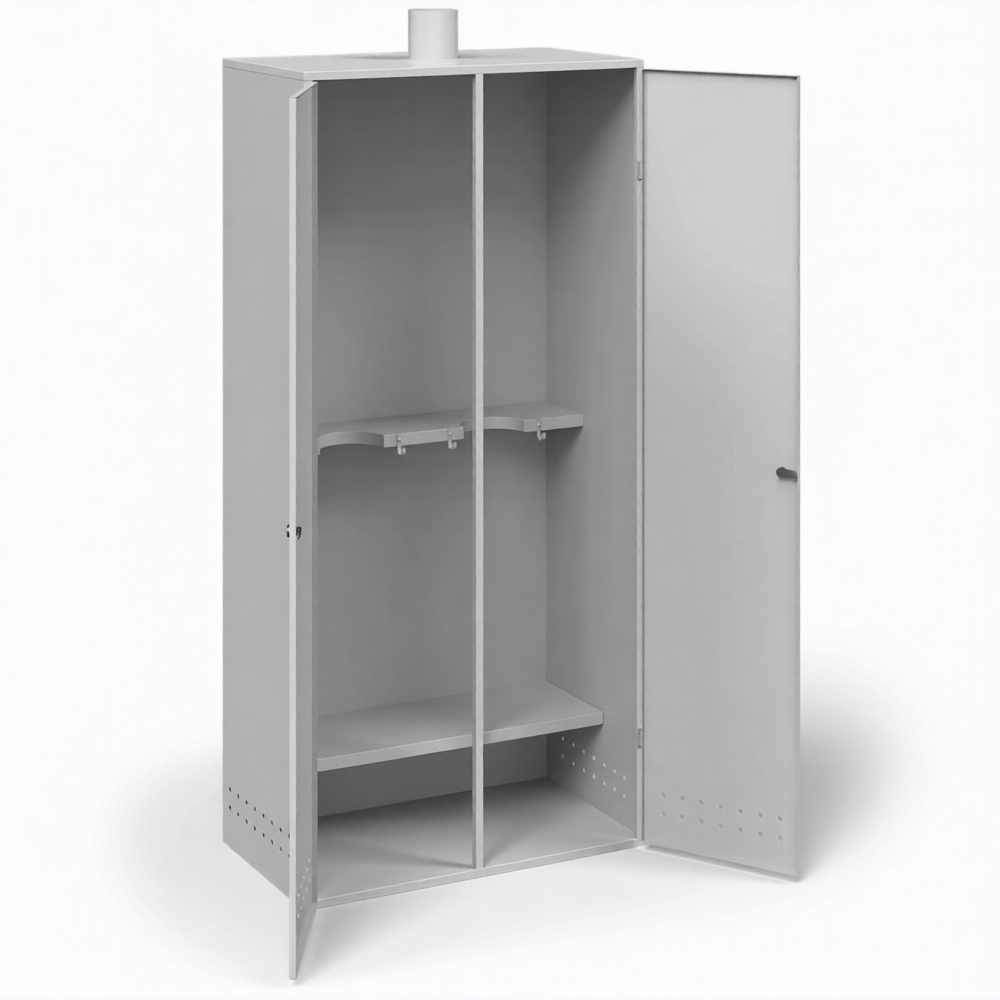 - Обеспечение требований пожарной и промышленной безопасности — прочный усиленный металлический корпус надежно изолирует баллоны и оборудование от внешних источников возгорания. Система вентиляции обеспечивает необходимый воздухообмен для отвода возможных утечек газа. Хранение редукторов и шлангов в закрытом шкафу защищает их от попадания масел, жиров и грязи, что особенно важно для кислородного оборудования и является требованием правил безопасности.
