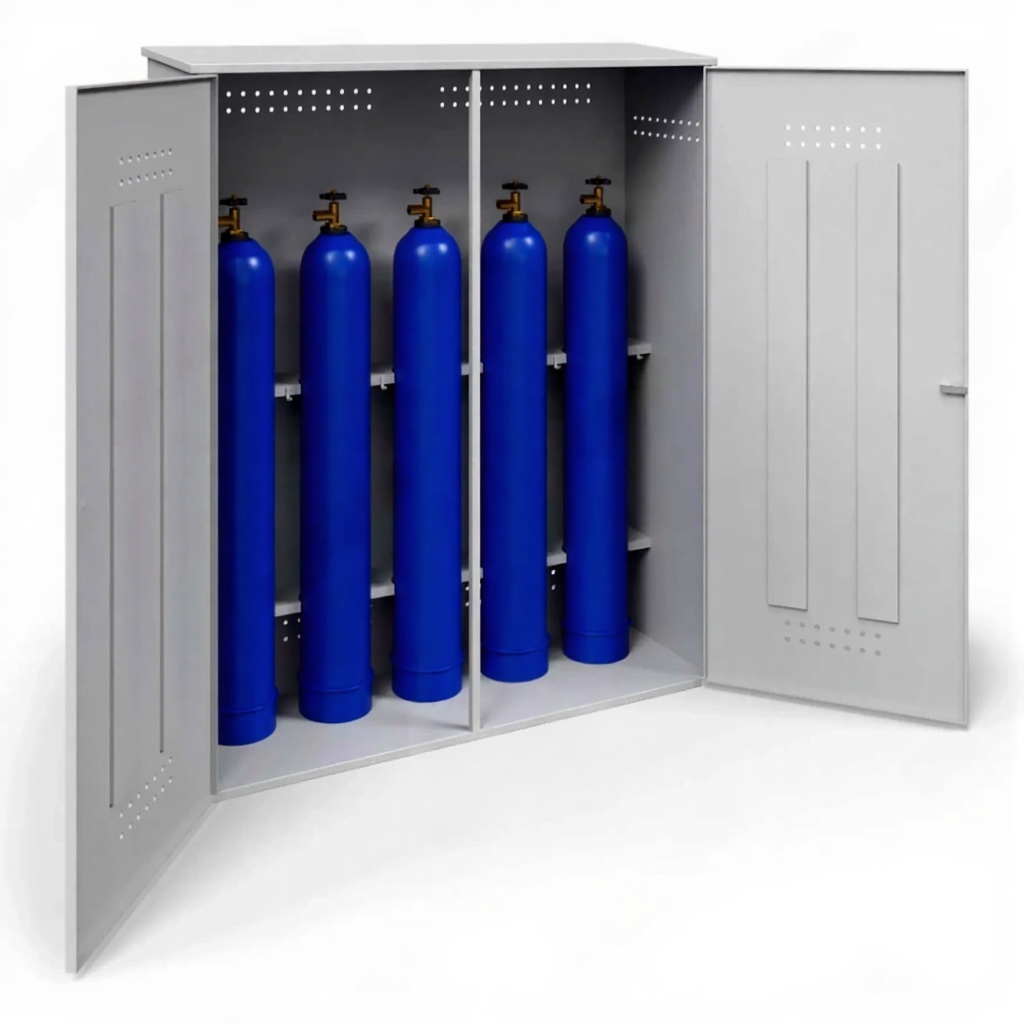- Обеспечение высочайшего уровня пожарной и промышленной безопасности — цельнометаллический сварной корпус надежно изолирует баллоны от любых внешних источников возгорания. Продуманная система вентиляции (как правило, выполненные методом резки с последующей обработкой жалюзийные решетки) обеспечивает необходимый воздухообмен для отвода возможных утечек газа, предотвращая создание взрывоопасной среды, что является ключевым требованием всех нормативных актов (ППР, ПБ).