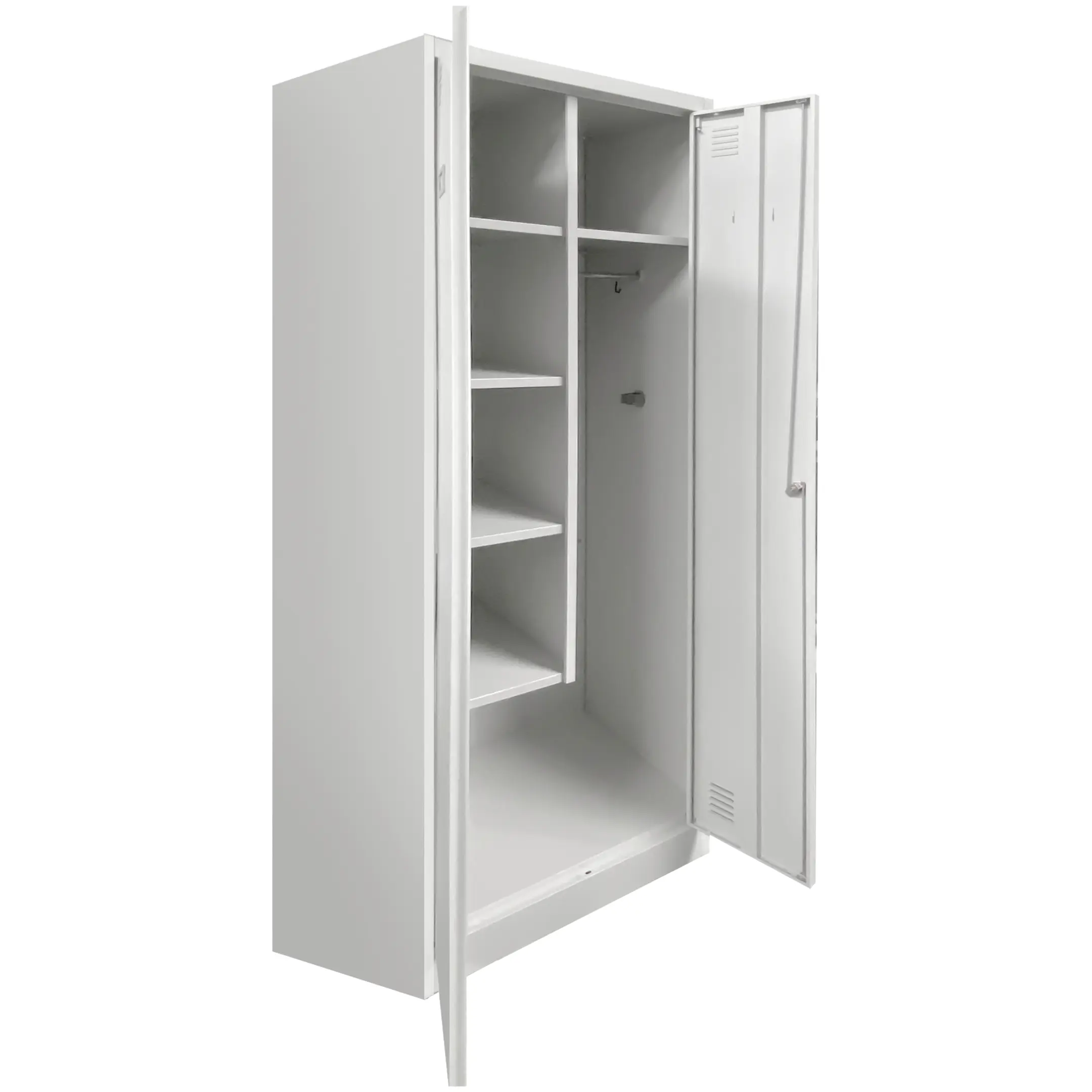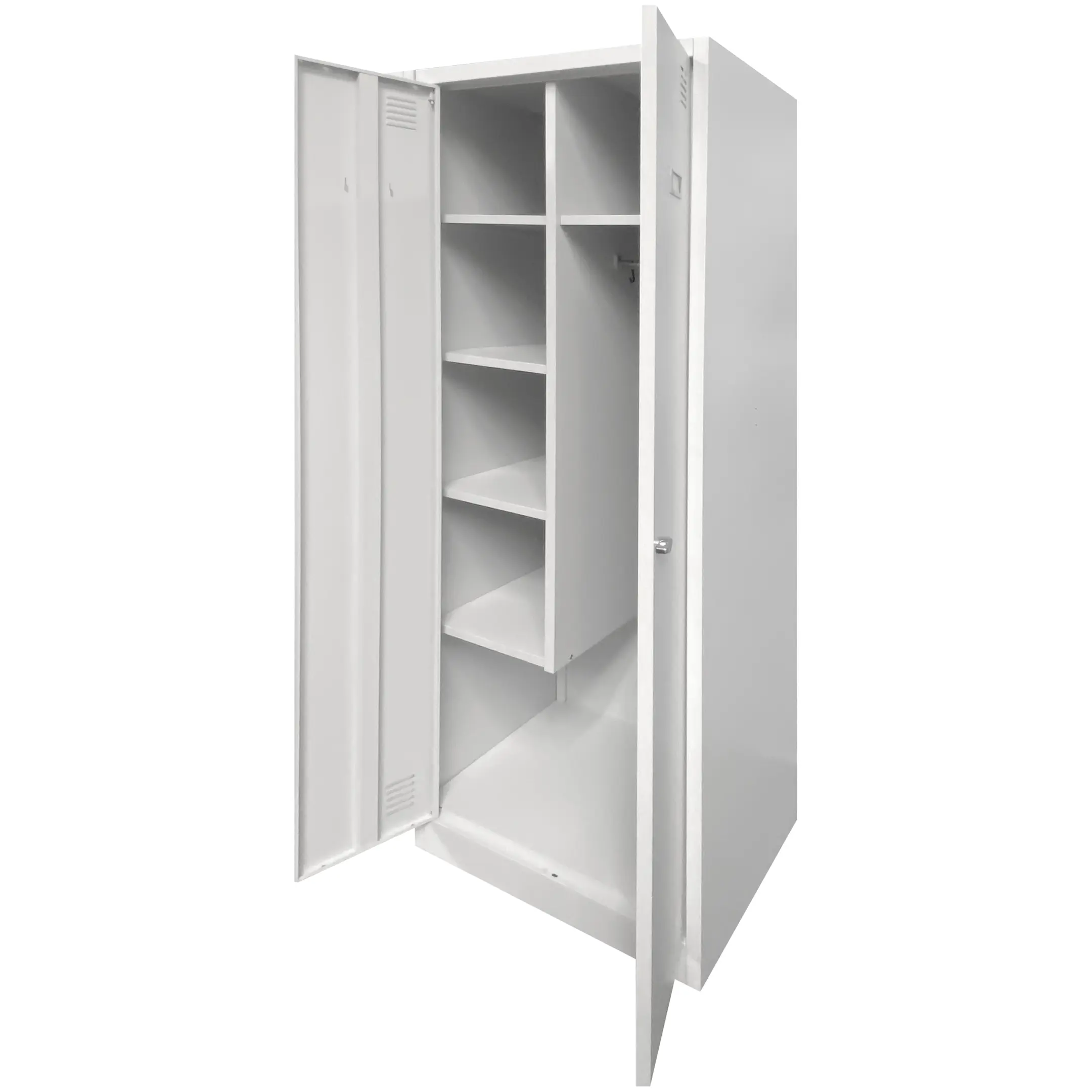 - Универсальность и функциональность — шкаф оптимально подходит для хранения всего спектра хозяйственного инвентаря: от швабр и ведер до моющих средств и рабочей одежды, обеспечивая порядок и систематизацию в любой организации.